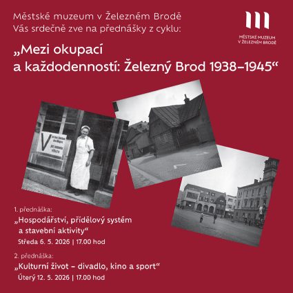 Srdečně Vás zveme na přednášky z cyklu „Mezi okupací a každodenností: Železný Brod 1938–1945“, které nabídnou pohled do života obyvatel našeho města během válečných let. Přednášky vychází z dobových fotografií, dokumentů, vyhlášek a plakátů, doplněných o vzpomínky pamětníků.