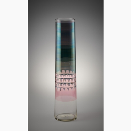 Malovaná váza monumentální velikosti vznikla v železnobrodské sklářské škole v roce 1967 jako klausurní práce studentky Evy Mirvaldové provdané Vágnerové. Eva Mirvaldová byla studentkou oboru malovaného a leptaného skla, který v té době vedli Vlasta Maryšková, jako dílenská vedoucí a malíř Jan Novotný, který obor vedl po výtvarné stránce. Tenkostěnná váza válcového tvaru je na povrchu zdobena geometrickými vzory malovanými barevnými listry a je kvalitní a typickou ukázkou malovaného skla tohoto období.